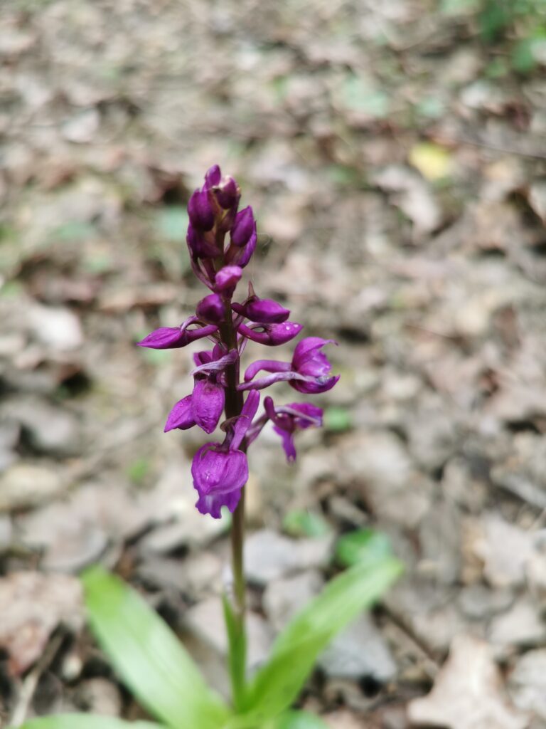 Mais la vraie surprise du jour nous attendait au détour d’un sentier forestier : une Orchis mâle (Orchis mascula), dressée au milieu des feuilles mortes, avec sa hampe florale d’un violet profond. Une orchidée sauvage, ici, à deux pas de chez nous. Un trésor que l’on passe sans le voir quand on ne sait pas regarder.
