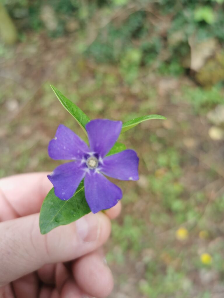 Au fil de la balade, nous avons levé les yeux sur un cortège printanier discret mais somptueux : la pervenche mineure (Vinca minor) et ses cinq pétales bleu-violet tendus comme des étoiles, les premières fleurs jaunes tapissant les talus…