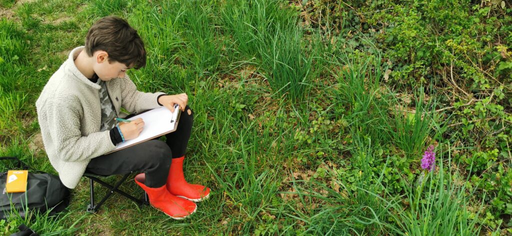 Carnet posé sur les genoux, crayon en main, les bottes rouges bien enfoncées dans l’herbe : voilà comment on s’installe quand on veut dessiner une orchidée sauvage comme un vrai naturaliste. L’Orchis mâle (Orchis mascula) était de nouveau au rendez-vous, dressée dans les hautes herbes de la prairie — et cette fois, elle a eu droit à un portrait d’une précision remarquable. Regardez bien les feuilles tachetées : elles y sont ! 🎨