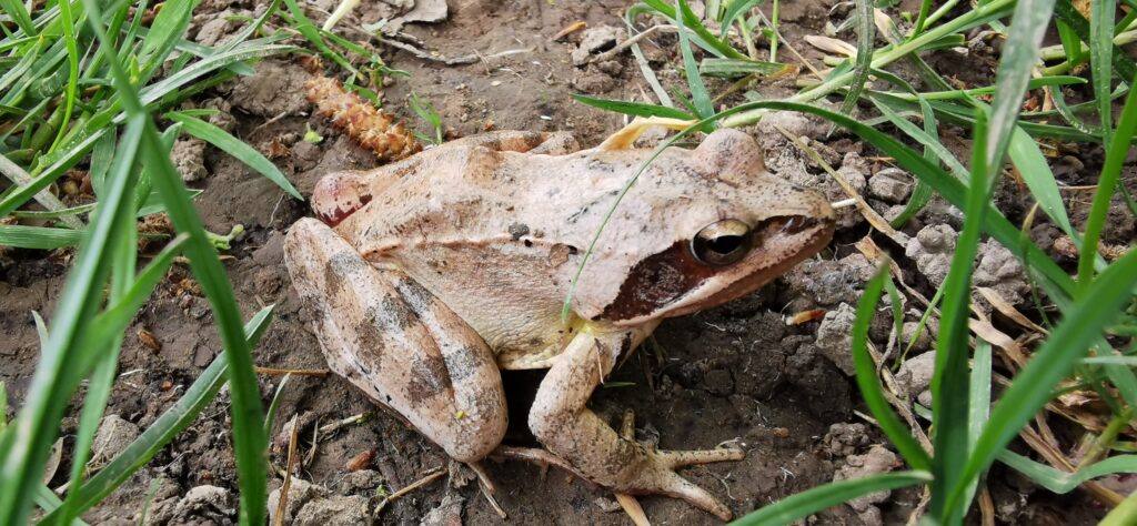 Mais la vraie surprise de l’après-midi nous attendait au bord du chemin, immobile dans la boue fraîche : une Grenouille rousse (Rana temporaria), reconnaissable à sa tache temporale sombre et à sa peau finement marbrée. Le temps d’une photo, elle a posé sans broncher — avant de disparaître d’un bond dans les herbes. 🐸